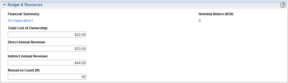 In the Budget & Resources section, enter the nominal return, total cost of ownership, direct and indirect annual revenue, and the average headcount supporting the application.