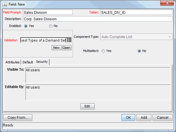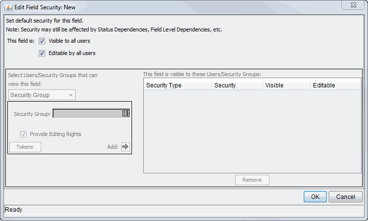 Use the auto-complete field to select the security groups, users, standard tokens, or user-defined tokens that you want to be able to view this field.