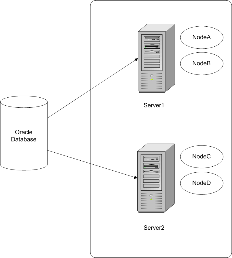 The figure below shows an example of a server cluster that includes two host machines, Server1 and Server2. Server1 hosts NodeA and NodeB. Server2 hosts NodeC and NodeD. You want to create a server cluster between Server1 and Server2 and include all the nodes (NodeA, NodeB, NodeC, and NodeD) on both servers. As long as the ports assigned to each PPM Server do not overlap with any port set assigned to another PPM Server on the same host, no port conflicts occur.