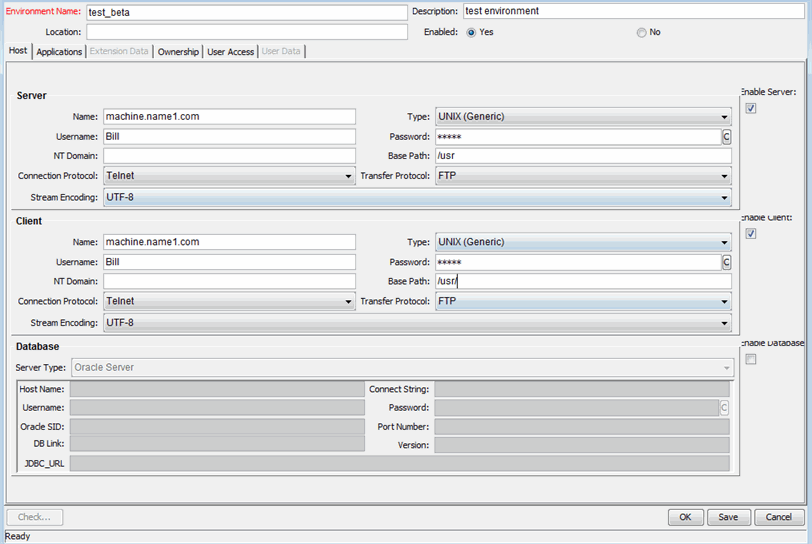 The environment client represents a remote client machine that also serves to identify the specified environment. The client is typically defined if users are doing multiplatform development in a client/server environment, with some development done on UNIX, and some on Windows Server. The client can be a file server that stores client code accessed by users. Many programs, such as transactional forms, have both client and server components; for example, the user interface code and the database objects, respectively. Figure 1-8. Sample environment shows an example of information displayed in the Environment window.