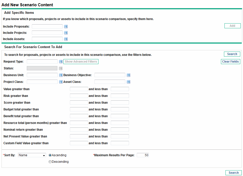 Complete the fields in the Search For Scenario Content To Add section of the scenario comparison as needed.