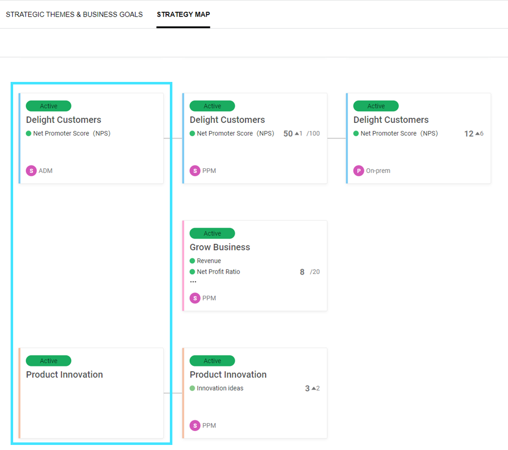 • To view the strategic themes that are inherited by the immediate subportfolios, refer to the right part in the Horizontal structure or the bottom part in the Vertical structure.