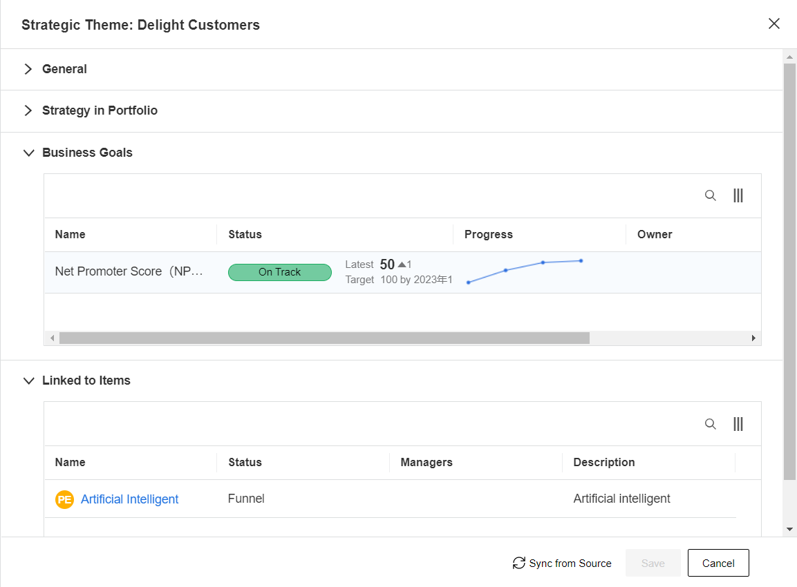 5. (Optional) Sync strategic theme from its source. When the strategic theme is out of sync with the source, the Sync from Source option becomes enabled.