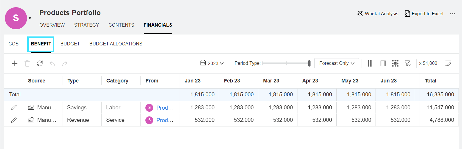 You can edit benefit lines that are added at the portfolio level. If a manually added benefit line includes forecasts only, you can delete the line. |