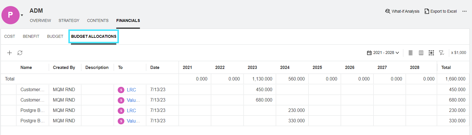 Rolled up from a program's contents To learn from which portfolio content the budget comes, see the From column.