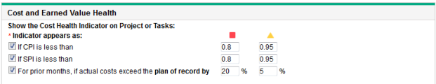 The Cost and Earned Value Health policy controls which metrics will be enabled and used to determine the health.