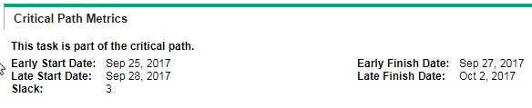 Example: Suppose a task's scheduled start date is September 25, 2017 and its scheduled duration is 3 days; while the work plan's scheduled finish date is October 2, 2017, then the task's slack is 3.