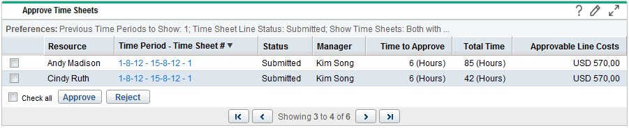 - To filter the time sheets displayed on the portlet, click the Edit button on the portlet and edit the portlet preferences. The portlet filter criteria are the same as those on the Approve Time page. For details, see Use the Approve Time page.