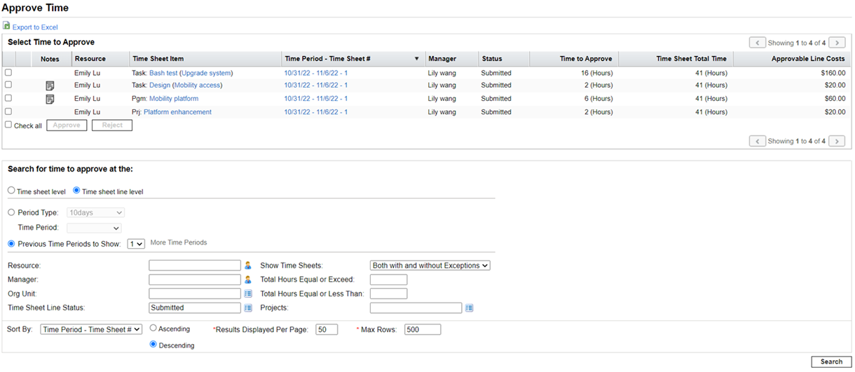 To search for time sheet lines to approve or reject, click Time sheet line level.