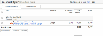 Note: If a task in a work plan has a specified activity, that task can have only that one activity and you cannot change it or add any other activity to it. If a task in a work plan has no specified activity, you can select and add one or more predefined activities to that task on the time sheet. Multiple activities are not transferred to the work plan, but their total time is.