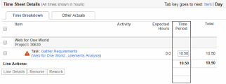 Note: For projects that are integrated with Time Management, after users enter actual effort for tasks on the Time Breakdown tab, the time sheet update service (TM-PM Sync Service) sends updates of that actual effort to the project work plans for those tasks, as often as specified by the service (by default, every 3 hours). Providing these updates as a service improves the performance of Time Management. For information about configuring services, see the System Administration Guide and Reference. For information about projects, work plans, and tasks, see the Project Management User Guide.