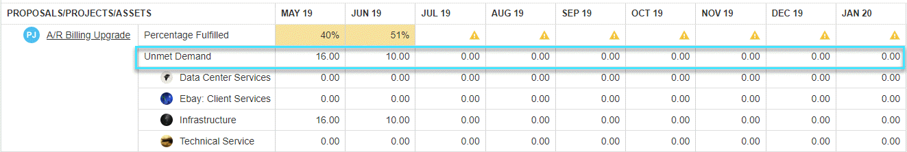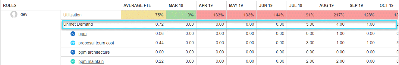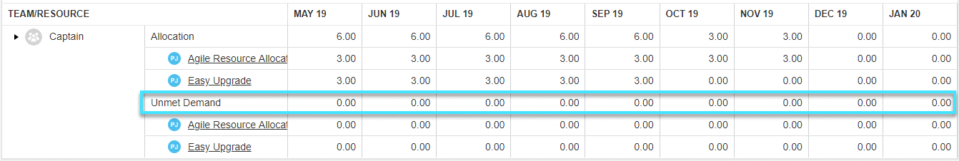 Sum of demand that is not fulfilled by the team and its sub-teams. Position's unmet demand is targeted on the team that is specified in the position's Resource Pool column. For example. if a position specifies Team A in its Resource Pool column, Team A does not assign any effort to the position, but a sub-team of Team A does, the unmet demand of the position is still targeted on Team A. Which entities still have demand not fulfilled by the team and its sub-teams If an entity has no unfulfilled demand by the team or its sub-teams, it is not listed here. |