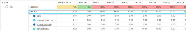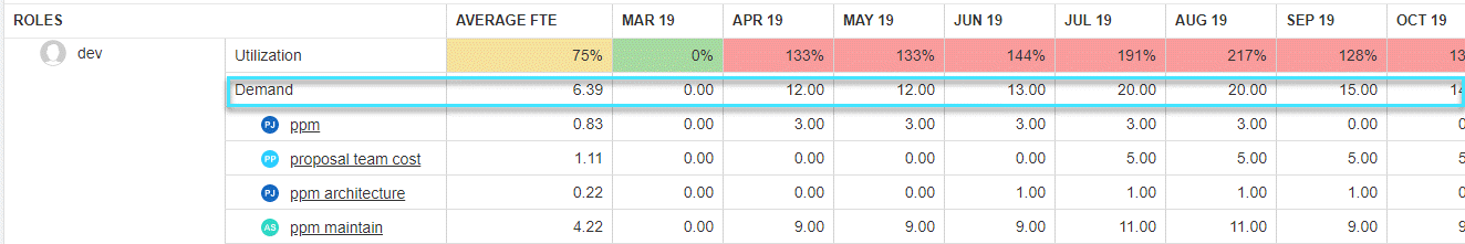 - Demand: Sum of demand that is required from the position roles where the team, its sub-teams, and its direct resources are assigned