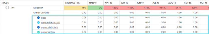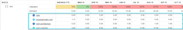 The Role view can show any combination of the following data that is grouped by role. The roles include the roles of the positions that require demand from the team and its sub-teams and the roles of the team's direct resources.