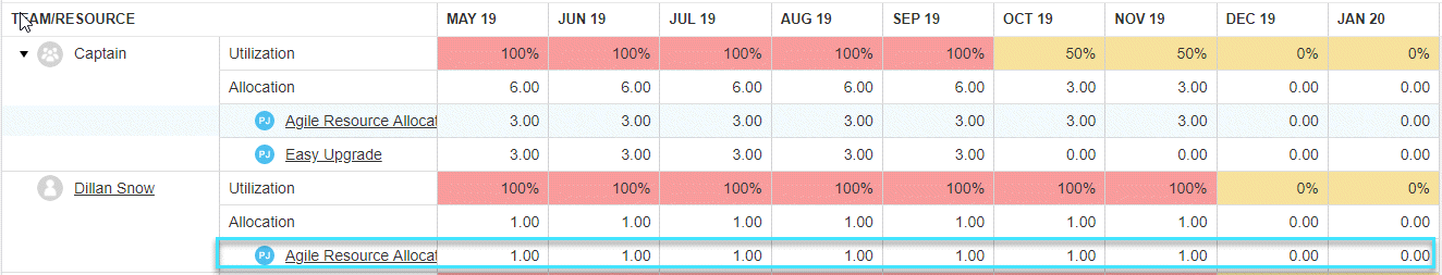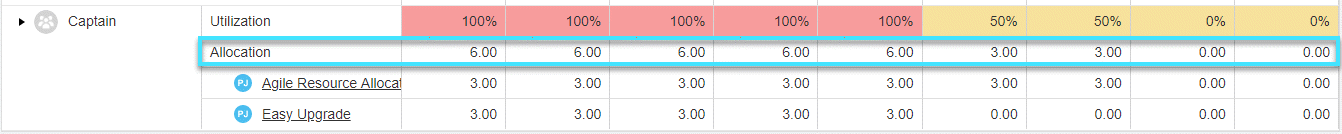 - Allocation: Sum of the effort that is assigned to the position roles where the team, its sub-teams, and its direct resources are assigned