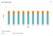 What the chart shows The chart shows how many resources there are in your team per month during a specified period. It is the sum of the direct resources in your team and resources in your sub-teams. Both named and unnamed resources are counted. What the chart may tell you The chart can indicate the staff turnover during a given period. For example, you may find one month has more staff reduction than other months. Tip: The No. of Resources portlet provides the same chart as the No. of Resources chart. What if you care more about your team capacity If you think your team is relatively stable, and you care more about your team capacity, you can go to the Team Heatmap tab. For details about Team Heatmap, see Team Heatmap. |