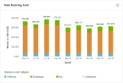What the chart shows The chart shows how much it costs to run a team per month during a specified period. The Running Cost represents the cost of paying for each resource in your team. How running cost is calculated Payment of a resource = Resource participation in the team x Resource cost rate. Tip: Total Running Cost portlet provides the same chart as the Total Running Cost chart. Extra right required to view the chart If the team is already viewable, you must also have one of the following permissions in order to view this chart: