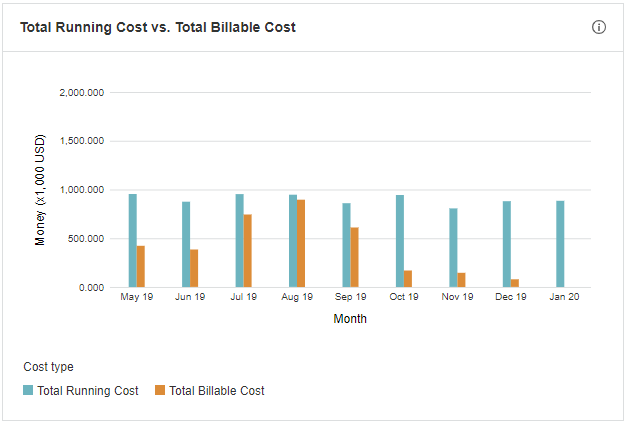 What the chart shows The chart shows comparison between running cost and billable cost. What the chart may tell you It straightforwardly tells you whether or not your team makes profit and how your team’s financial performance is over time. Extra right required to view the chart Same as who can view the running cost chart. |